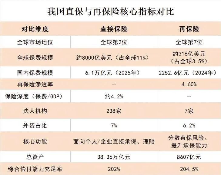 但与直保市场相比,我国再保险市场发展仍显滞后:市场规模位列全球第七,再保险渗透率仅4.6%,远低于12.5%的全球平均水平,巨大的市场潜力亟待释放。